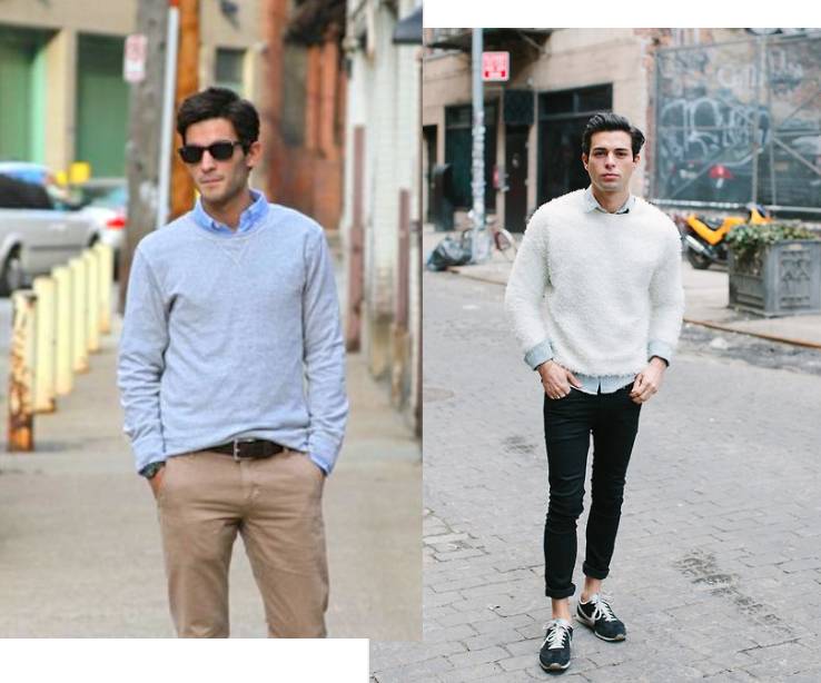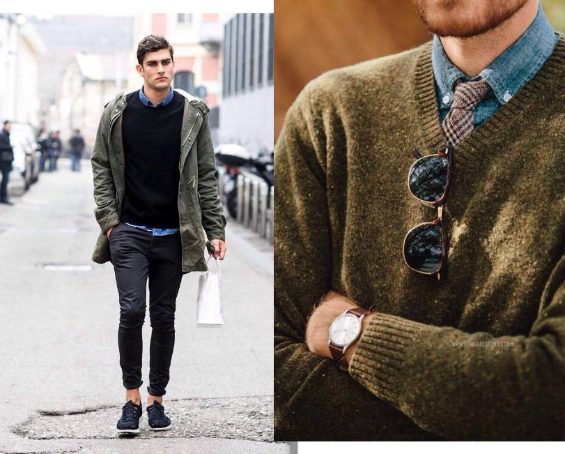 稍浅的丹宁衬衫配灰色或者驼色针织衫,而深一些的衬衫领子在同色系的藏青或今年大热的橄榄绿款中露出来就很好看。不过切记:不带编花的纯色针织外套,才是一个作家的选择。
