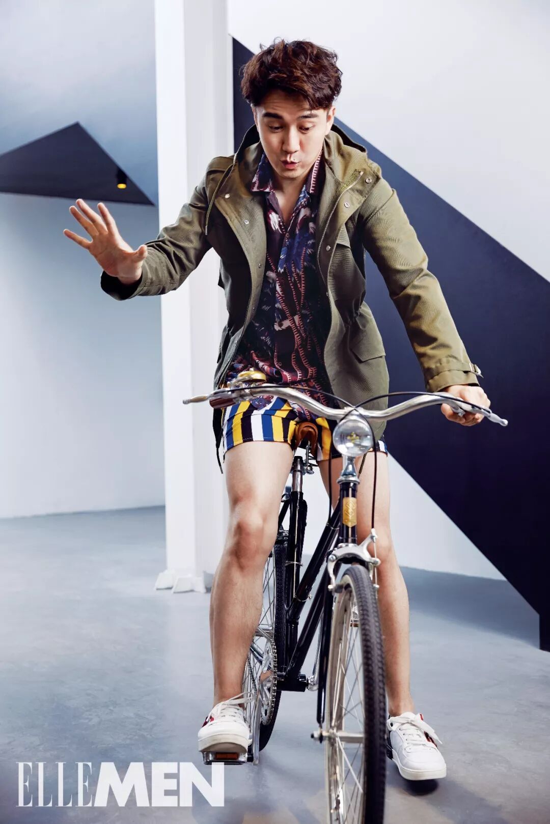 军绿色连帽外套 条纹短裤 均为Sandro
