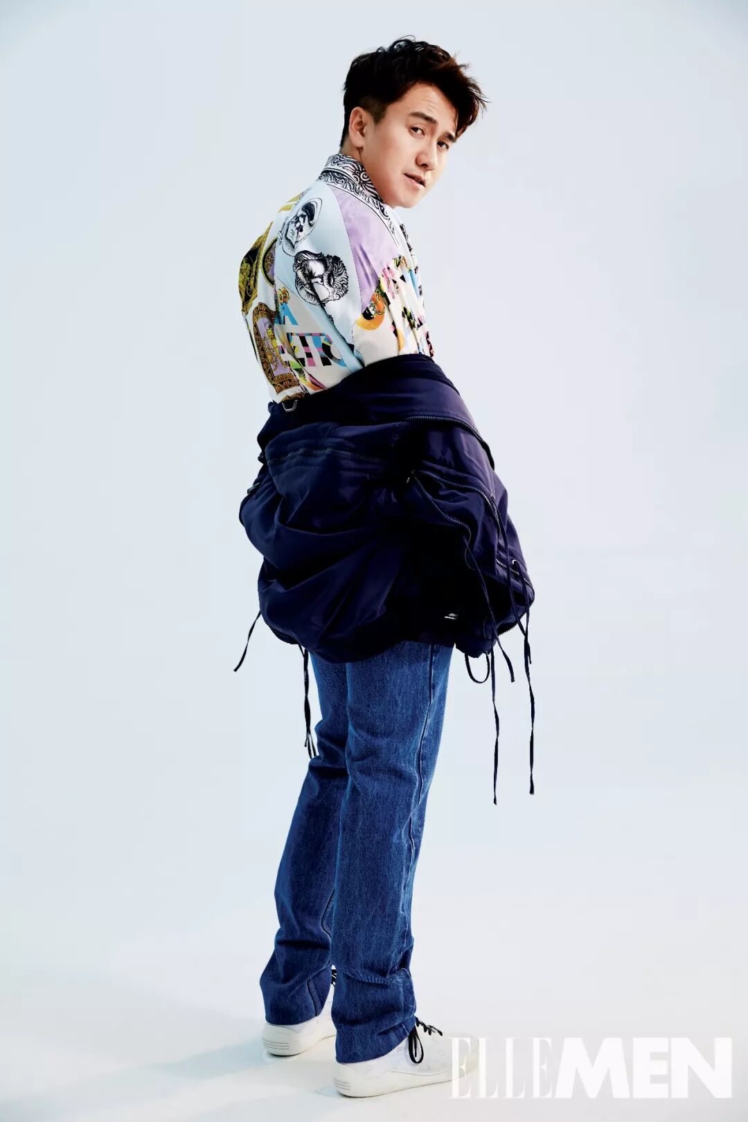 蓝色皮夹克 灰色人像印花衬衫 灰色直筒长裤 白色系带运动鞋 均为Lanvin